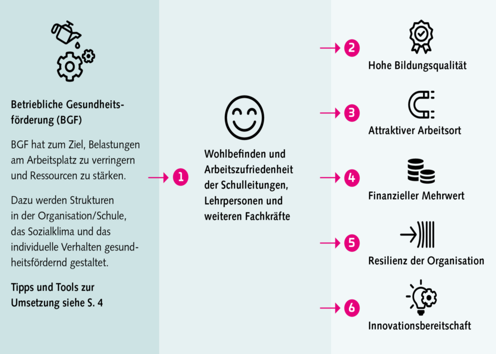 Eine Schule kann sich durch die systematische Gesundheitsförderung von anderen Schulen abheben. In Zeiten des Fachkräftemangels positioniere sie sich damit als attraktive Arbeitgeberin, argumentiert die Allianz. Lehrpersonen würden sich stärker mit der Schule verbunden fühlen, wenn sie Unterstützung durch die Schulleitung und das Kollegium erfahren.