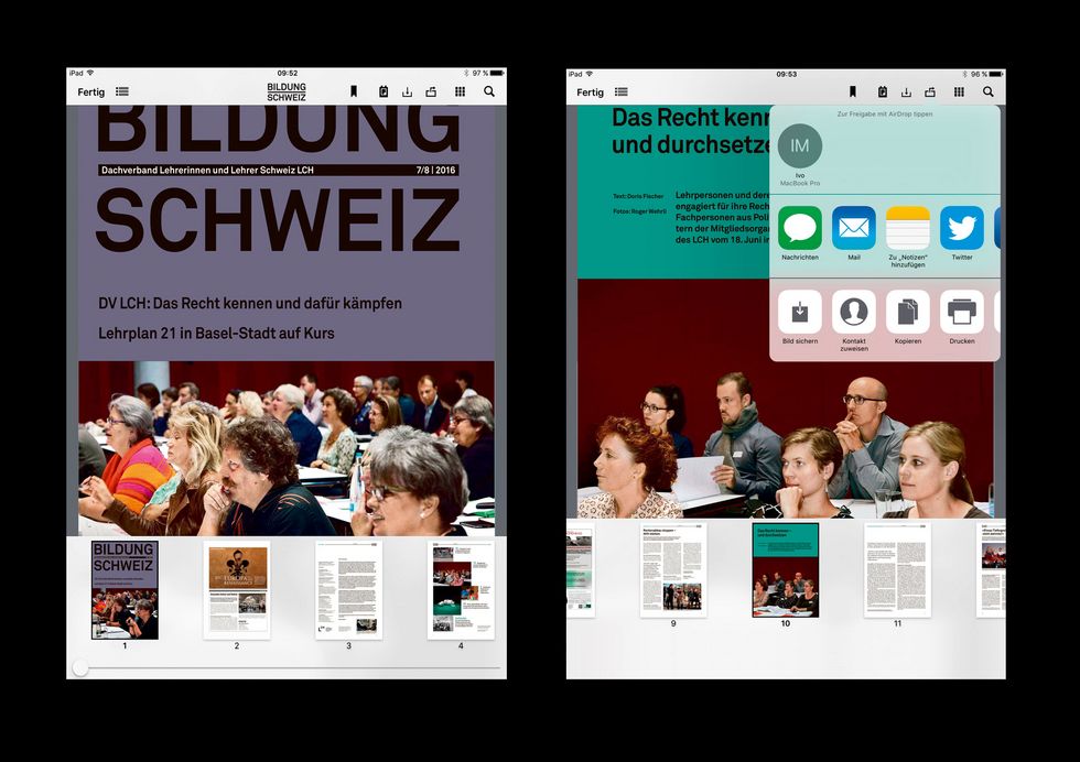 Mit der App können Sie direkt auf die aktuelle Ausgabe von BILDUNG SCHWEIZ zugreifen. Die benutzerfreundliche Oberfläche ermöglicht es, das Fachmagazin in einer ansprechenden Darstellung zu lesen. Sowohl die praktische Miniaturansicht der einzelnen Seiten als auch das Inhaltsverzeichnis schaffen Orientierung und erleichtern so die Suche nach spezifischen Artikeln. Ausgewählte Seiten können komfortabel kopiert, heruntergeladen oder per Mail verschickt werden. Weitere Vorteile der App sind die effiziente Suchfunktion und die Möglichkeit, ausgewählte Seiten mit Lesezeichen zu markieren oder mit Notizen zu ergänzen. Der schnelle und direkte Zugriff auf die gewünschte Ausgabe und die arbeitserleichternden Funktionen machen die App BILDUNG SCHWEIZ damit zum idealen Tool für unterwegs. Wer die Inhalte downloadet, kann sie schliesslich offline zu jeder Zeit abrufen.