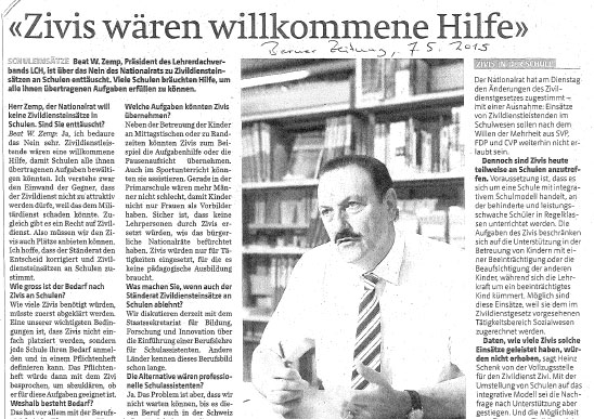 Den Vorschlag des Bundesrates, Zivildienstleistende künftig an Schulen einzusetzen, hat der Nationalrat am 5. Mai 2015 abgelehnt. Der Dachverband Lehrerinnen und Lehrer Schweiz LCH hätte sich einen anderen Entscheid gewünscht. „Zivildienstleistende wären eine willkommene Hilfe, damit Schulen alle ihnen übertragenen Aufgaben bewältigen könnten“, erklärt Beat W. Zemp, Zentralpräsident LCH, im Interview mit der Berner Zeitung. „Neben der Betreuung der Kinder an Mittagstischen oder zu Randzeiten könnten Zivis zum Beispiel die Aufgabenhiilfe oder die Pausenaufsicht übernehmen. Auch im Sportunterricht könnten sie assistieren“, ergänzt er. Dem Einwand, dass durch den Einsatz von Zivildienstleistenden eine Qualitätsverlust im Schulwesen entstehen könnte, sagt er ganz klar: „Zivis würden nur für Tätigkeiten eingesetzt, für die es keine pädagogische Ausbildung braucht.“