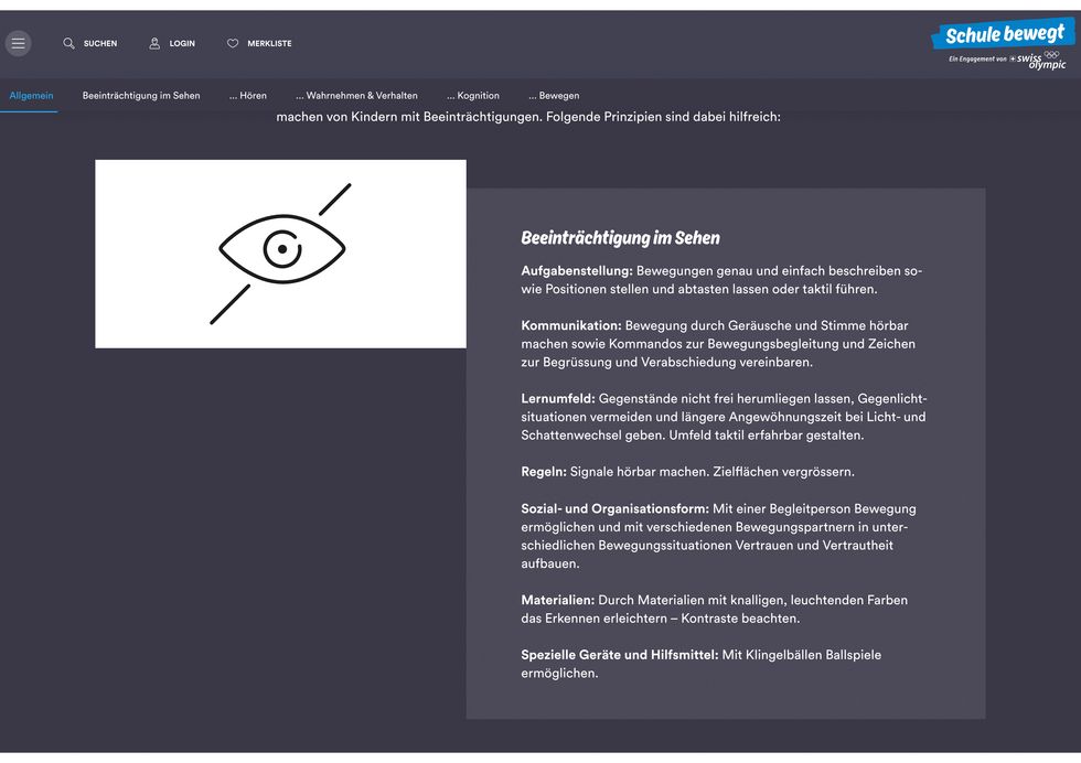 Die Online-Plattform «Schule bewegt» von Swiss Olympic bietet Lehrpersonen viele verschiedene Aufgaben, die zu mehr Bewegung im Unterricht anregen. Diese Aufgaben wurden nun mit Hinweisen dazu ergänzt, wie sie auf Personen mit einer Beeinträchtigung angepasst werden können.