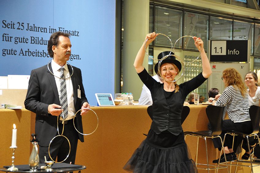 Anlässlich seines 25-jährigen Jubiläums hat sich der LCH ein umfangreiches und sehr vielseitiges Programm für seine Besucherinnen und Besucher einfallen lassen. So wurde u.a. das neue Lehrmittel «Hokus Pokus Fidibus. Zaubern mit Kindern von 4 bis 8 Jahren» aus der Verlagslinie Lehrmittel 4bis8 von der erfahrenen Zauberin Andrea-Katja Blondeau alias Andy Mayno vorgestellt. Die Künstlerin hat die Besucherinnen und Besucher am LCH-Stand mit ihrer Zaubervorstellungen begeistert und Tricks vorgeführt, welche die Lehrperson direkt vor Ort erlernen und einüben konnten.